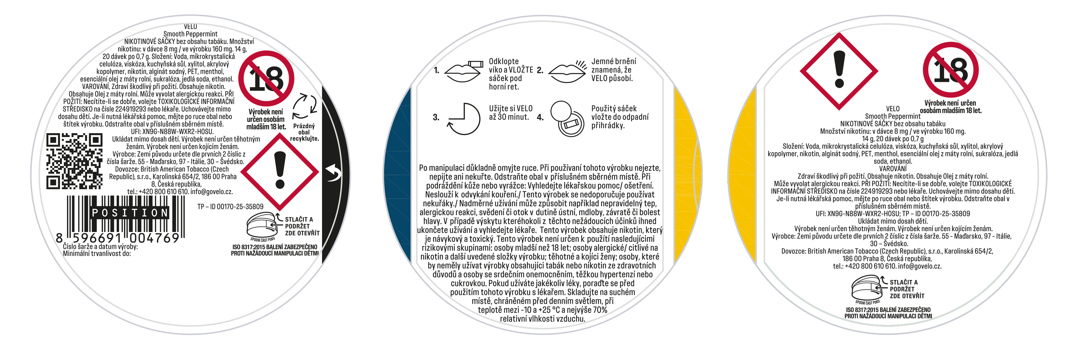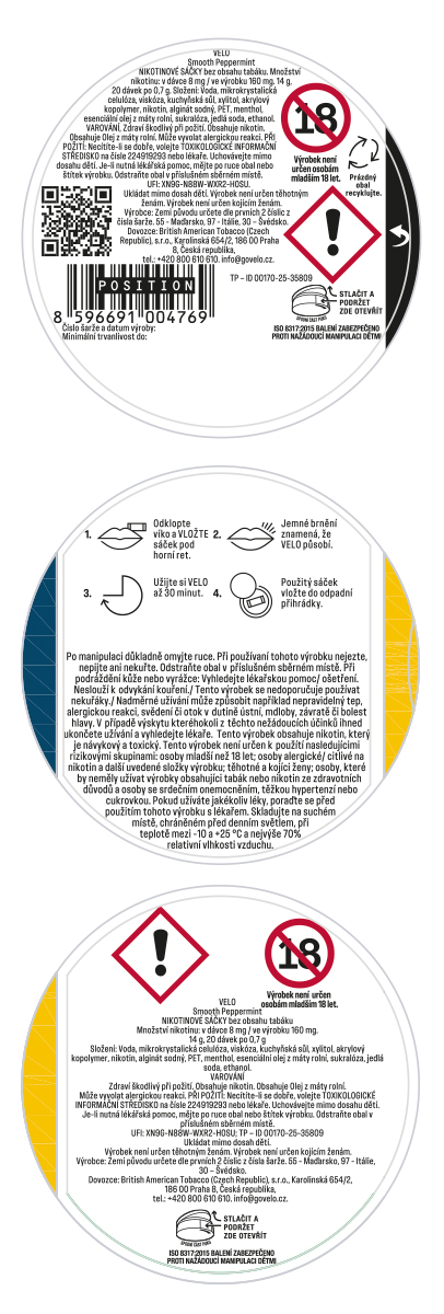 Výrobek VELO obsahuje nikotin, který je vysoce návykovou látkou. Tento výrobek není určen pro nezletilé a nedoporučuje se pro nekuřáky. Tento produkt může být nebezpečný pro zdraví.